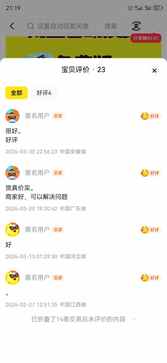 我刚在闲鱼买了一个商品,我发现了个原理,那就是商品评论区,如果大多人都不评价那说明商品不好甚至很差,因为那些人觉得一般般所以不评价或者说觉得差但是不敢给差评,因为自己也要发布商品,怕卖家找人给自己恶意评价等等.......